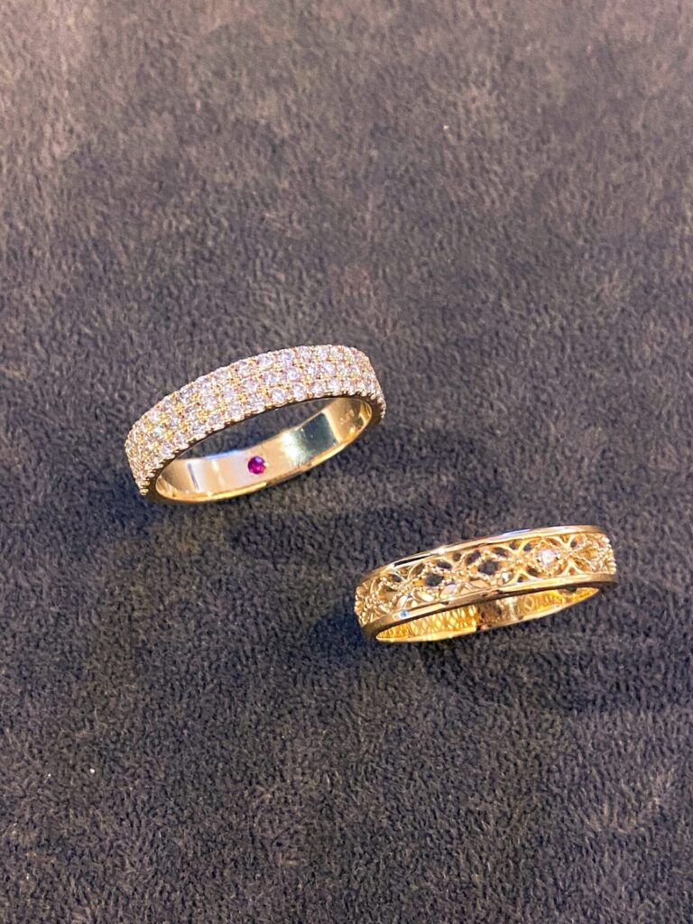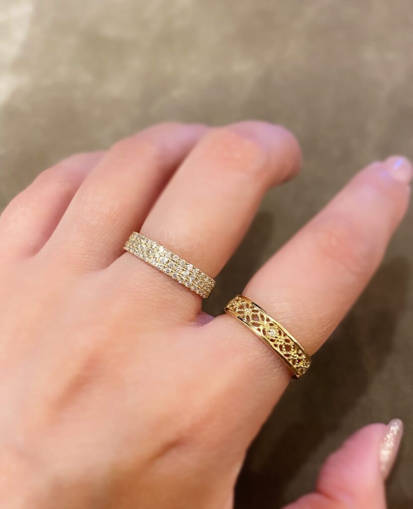 下のデザインはさりげなく中央にダイヤが1石留まった、透かし柄のもの✨繊細で素敵ですよね。
