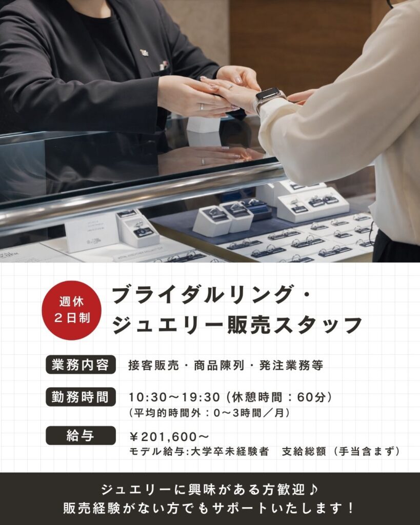 株式会社宝石堂では、ブライダルリングやジュエリーを通して、お客様の想いに寄り添う仲間を募集しています。未経験からスタートする方も多く、丁寧なサポートのもとで、少しずつ知識や接客を身につけていける環境です。